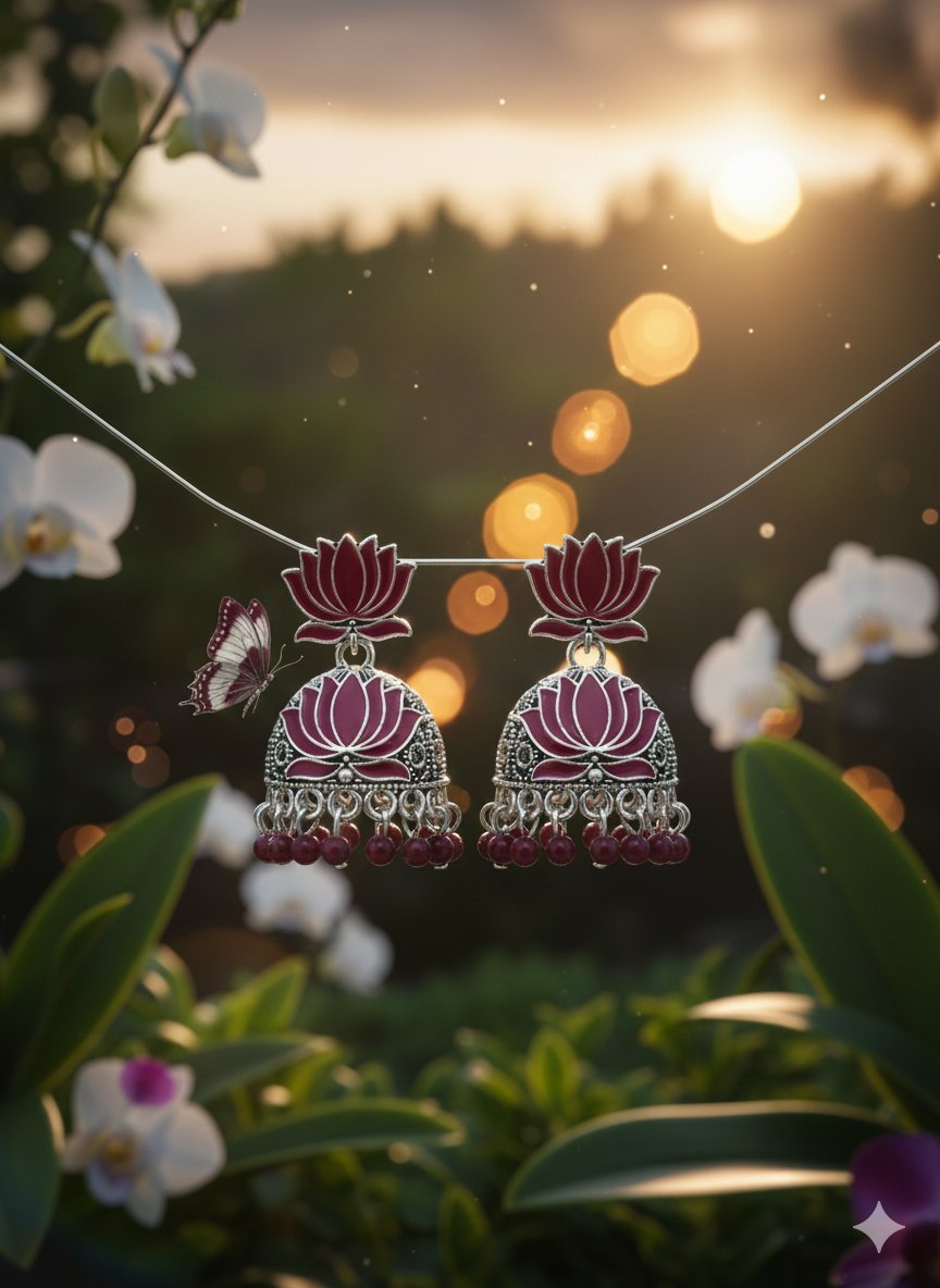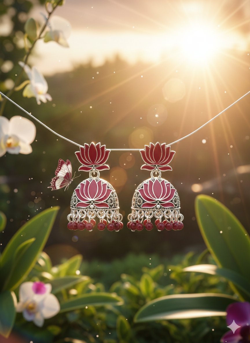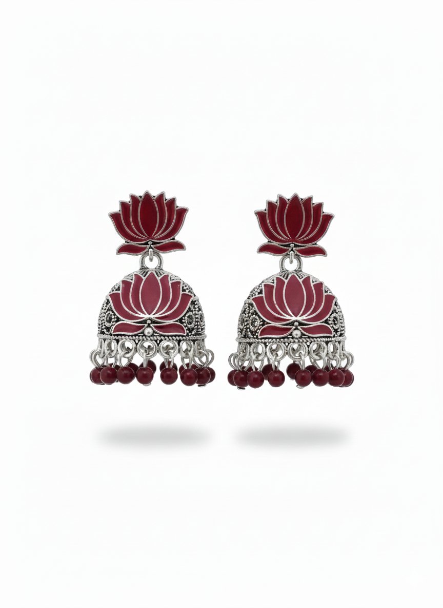 🌺 Crimson Lotus Silver Jhumka Earrings
