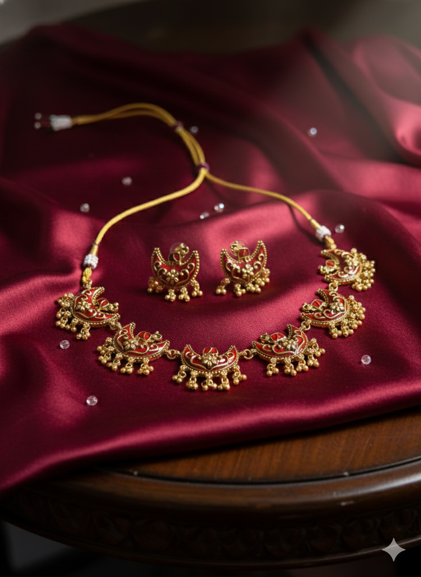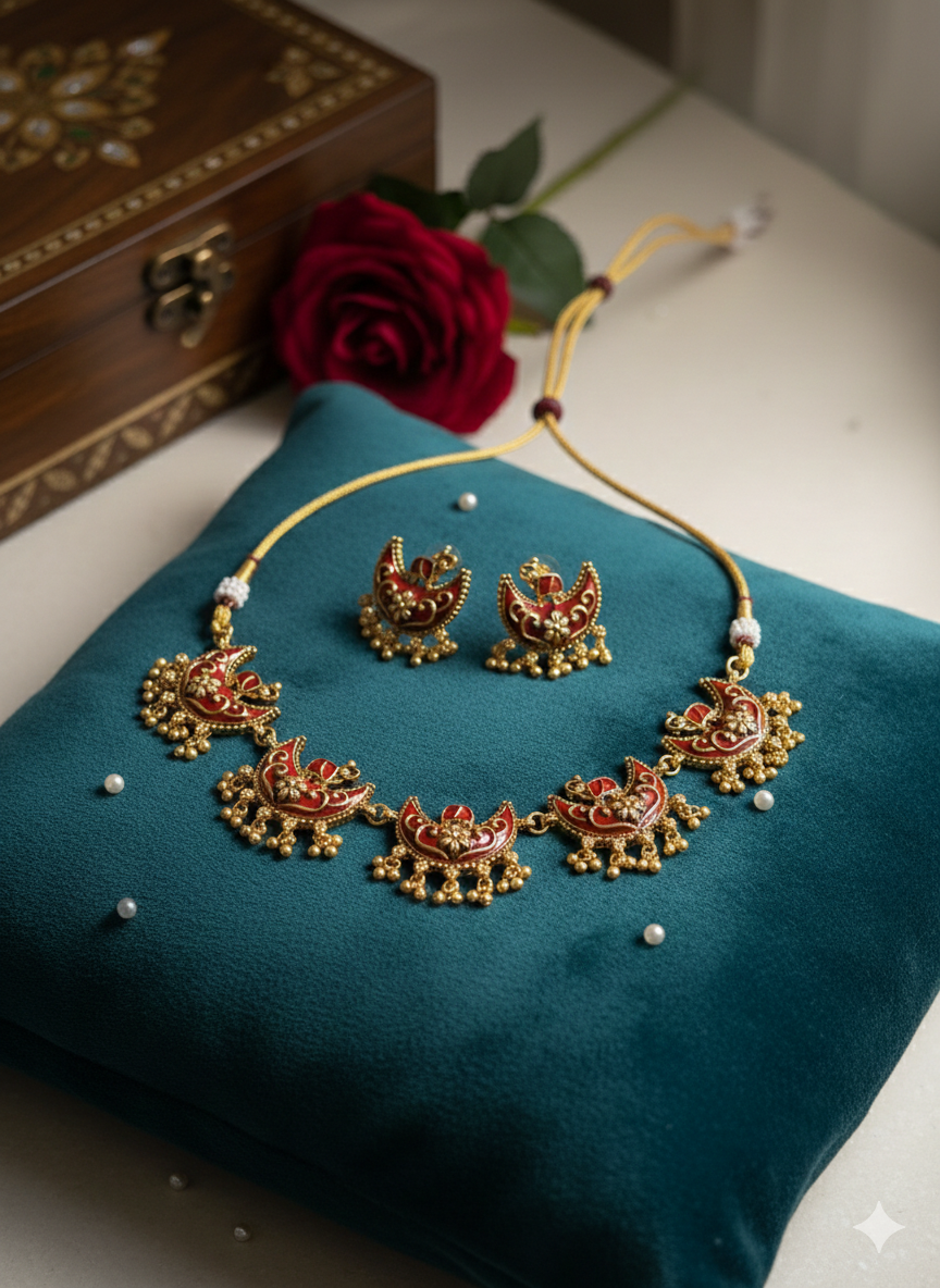 Is matt finish necklace set ka design traditional crescent (chand) motifs par based hai, jo classical Indian jewellery ka timeless charm dikhata hai. Har pendant par ki gayi red meenakari detailing aur neeche latakte chhote gold-toned ghungroo beads is set ko rich aur festive look dete hain.