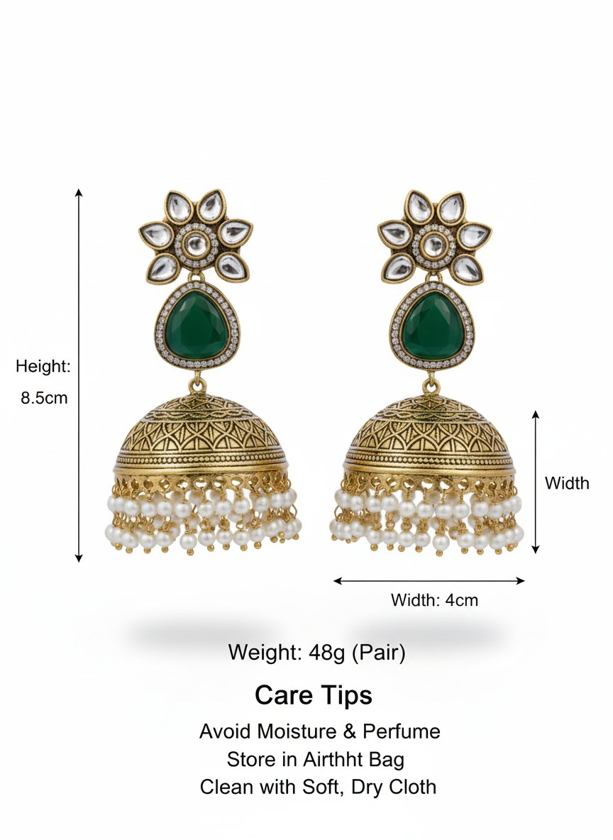 Add timeless charm to your ethnic collection with the Emerald Bloom Antique Jhumka Earrings. Designed with a beautiful floral kundan-style top and a rich emerald-green centerpiece, these earrings flow into intricately carved antique gold jhumkas finished with delicate pearl hangings.