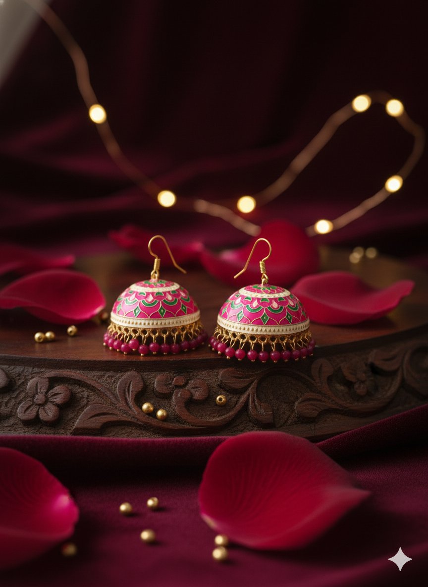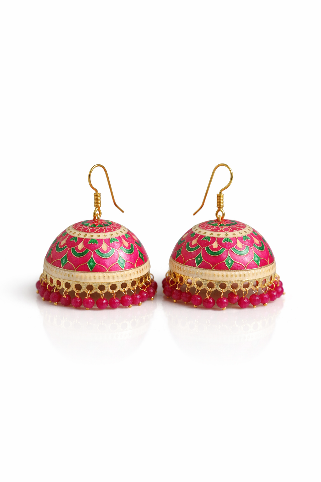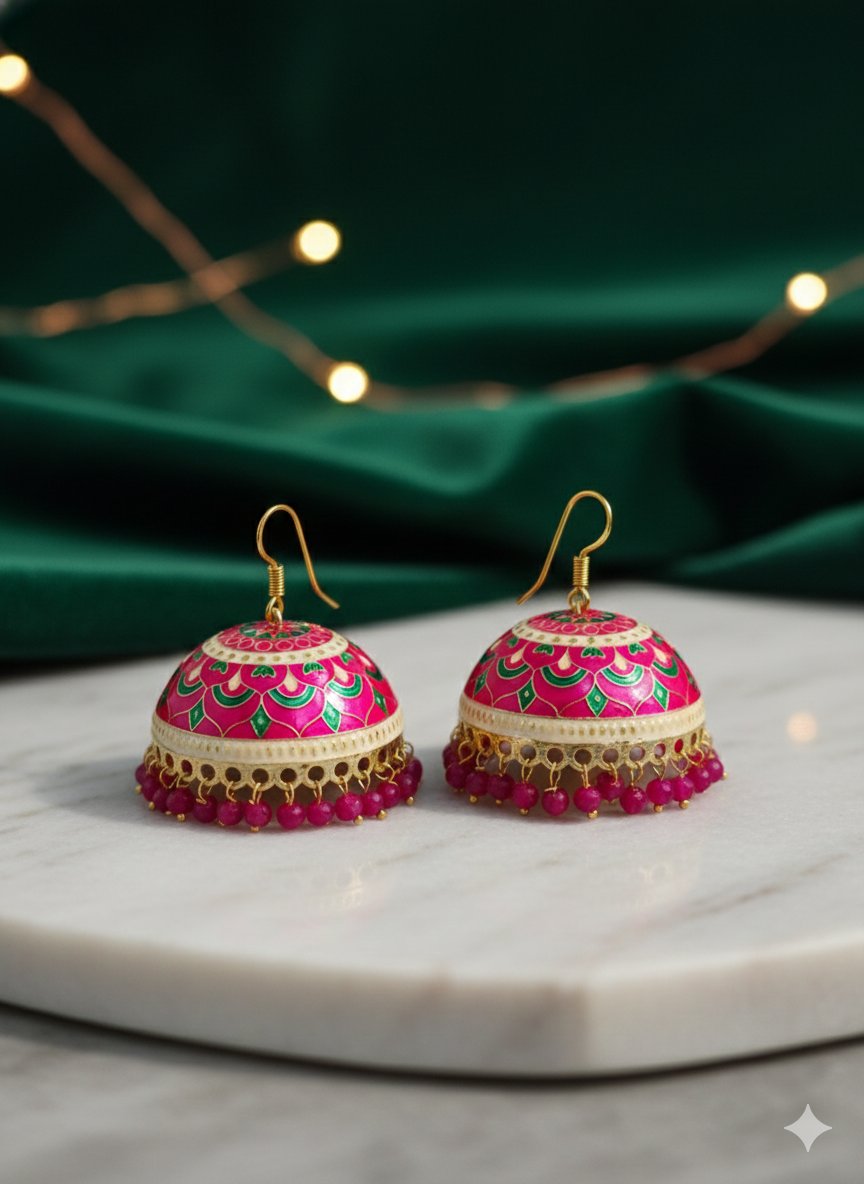 Celebrate vibrant tradition with the Gulnaar Meenakari Jhumka Earrings. Crafted in quality brass, these beautifully designed jhumkas feature intricate hand-painted meenakari work in rich pink and green tones, finished with a subtle gold border that adds a graceful ethnic charm.