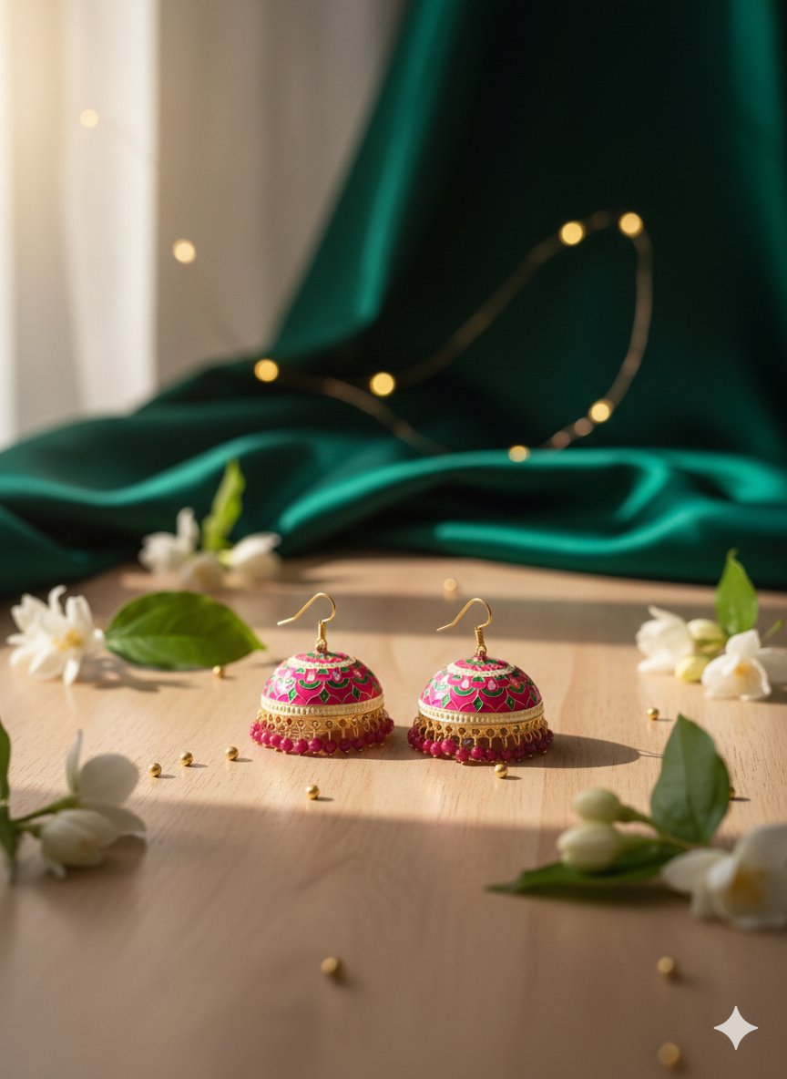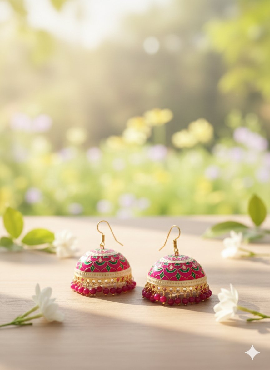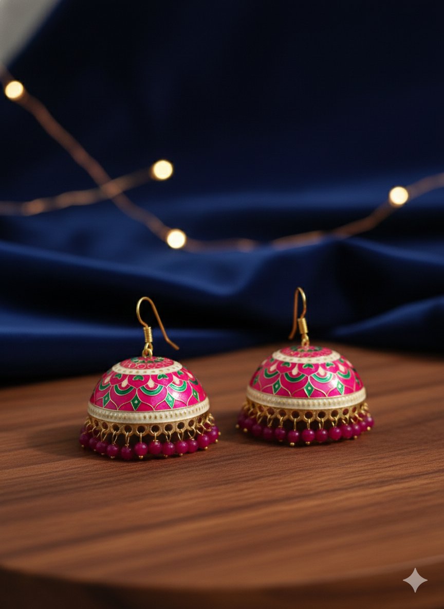 Celebrate vibrant tradition with the Gulnaar Meenakari Jhumka Earrings. Crafted in quality brass, these beautifully designed jhumkas feature intricate hand-painted meenakari work in rich pink and green tones, finished with a subtle gold border that adds a graceful ethnic charm.