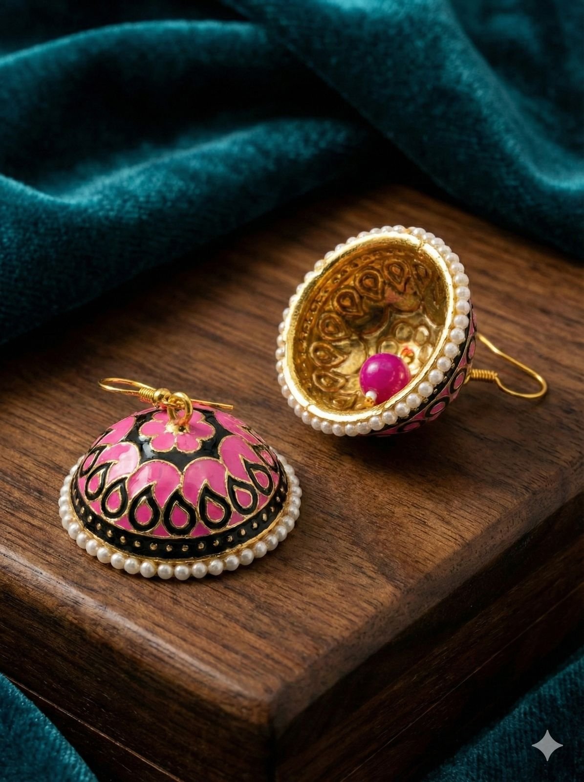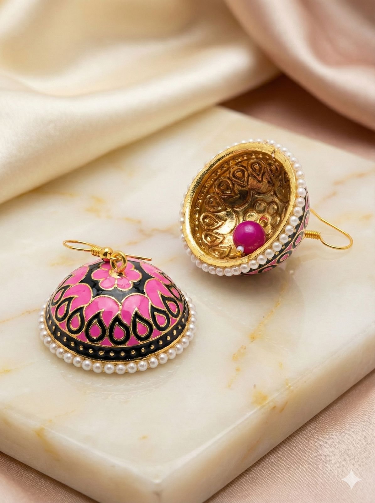 Yeh simple aur elegant meenakari jhumka earrings premium brass material se bane hue hain. Pink color enamel work, gold-tone finish aur neeche pearl border detailing inhe ek classy ethnic look deti hai. Lightweight aur comfortable design ki wajah se yeh daily festive wear aur traditional outfits ke saath easily match ho jate hain.