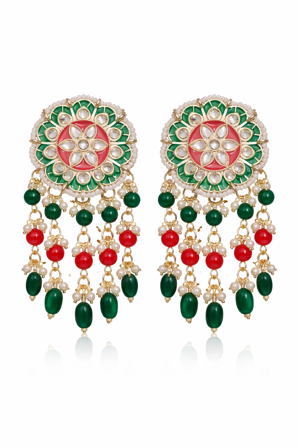 The big stud base is surrounded by delicate pearl detailing and finished with graceful multi-layer bead danglers in red, green, and white, creating a luxurious festive movement. Crafted from premium quality brass, these earrings are lightweight, durable, and comfortable for long wear.