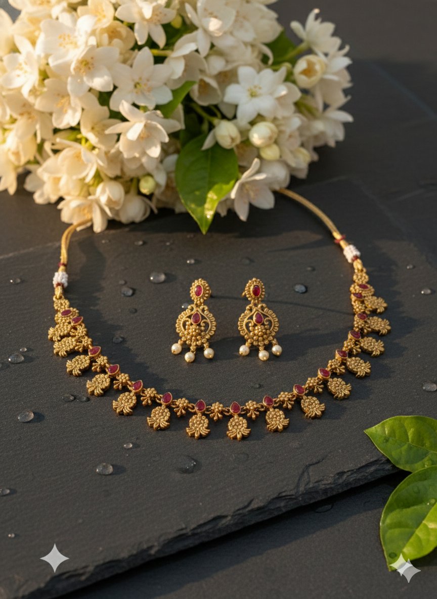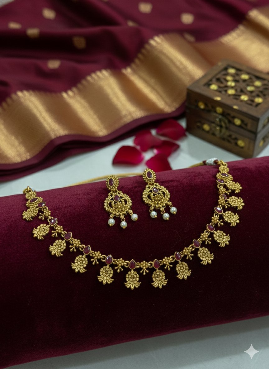 Add timeless elegance to your traditional look with this Royal Maroon Heritage Matt Finish Necklace Set. Designed with intricate floral motifs and adorned with deep maroon stone accents, this necklace reflects classic Indian craftsmanship. The antique matt gold finish gives it a rich, royal charm, while the delicate pearl drops add a touch of grace. Paired with matching earrings, this set is perfect for weddings, festive occasions, and cultural celebrations, making it a must-have piece for your jewellery collection.