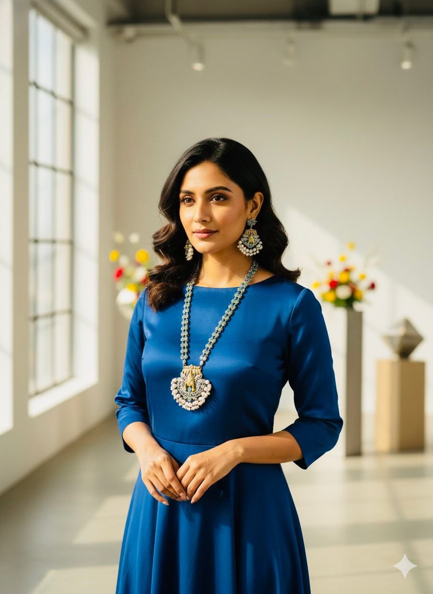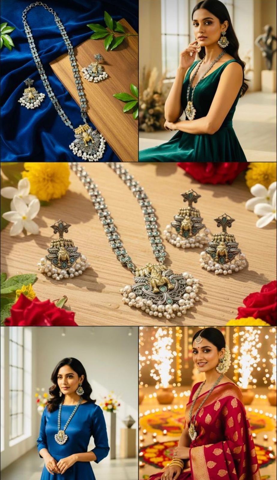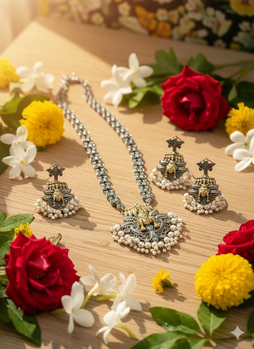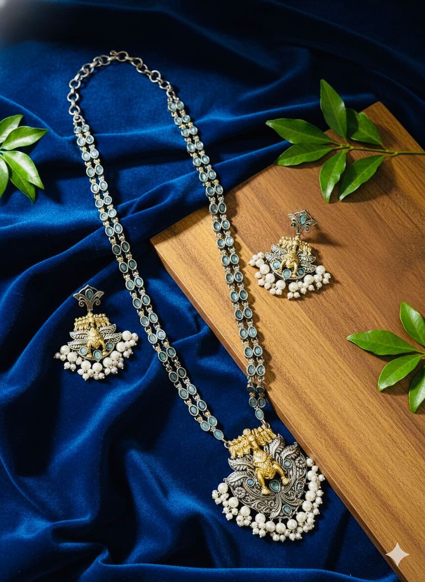 Yeh premium quality silver replica necklace set traditional symbolism aur fine craftsmanship ka beautiful combination hai. Necklace ke centre me Seven Horses design diya gaya hai, jo positivity, progress aur success ka pratik mana jata hai. Is set me high-quality brass base, elegant silver finish, subtle blue stone detailing aur neeche pearl hanging di gayi hai, jo isse ek rich aur graceful look deti hai. Matching earrings ke saath yeh set festive wear, pooja aur special occasions ke liye perfect choice hai.
